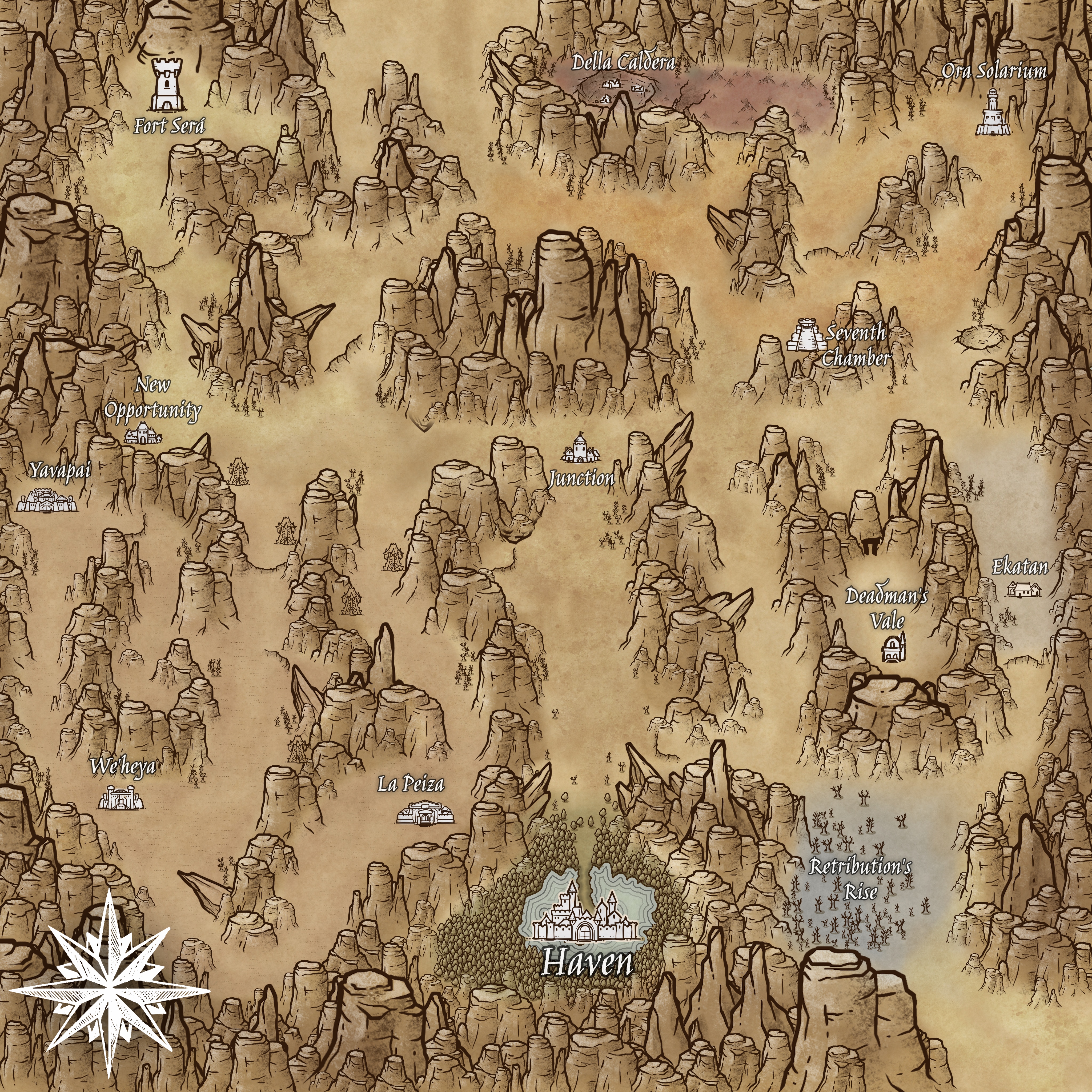 The Hidden Gulch is a series of canyons embedded into the southern portion of the Lunae Badlands. Rumors of hazardous terrain and ravenous monsters keep out most would-be travelers, and magic gates within the canyons prevent entry to all but those who carry Aeternalis — a mineral only found within the gulch. As such, outsiders generally require a guide to gain access.