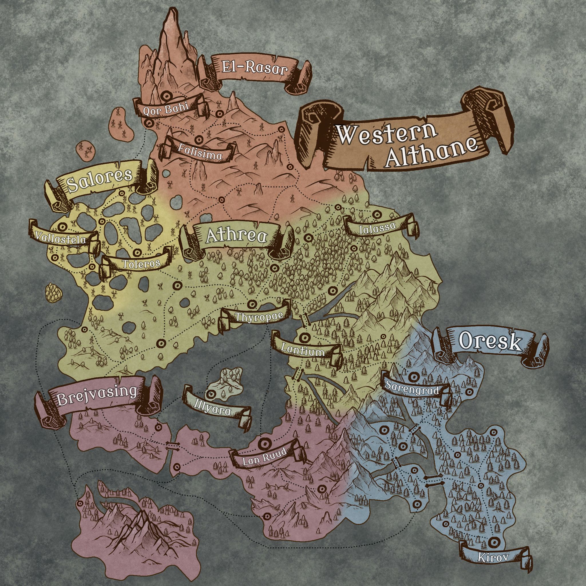 The Occident is the collection of countries on the western half of Althane. The current major ruling powers are Salores on the western coast, El-Rasar on the northern coast, Oresk on the southeastern peninsula, Brejvasing to the south, Illyara in the center of the Ghostrime Sea, and Athrea adjacent to the land bridge to the east.